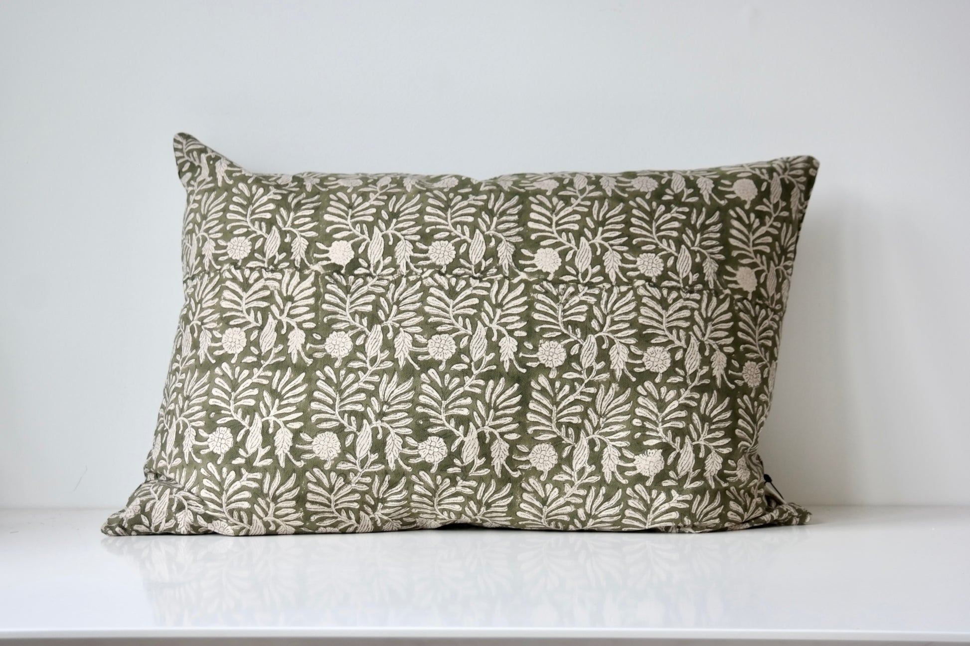 Hand block-printed in a soft ivory floral design over an earthy olive green base, this pillow brings a relaxed, artisanal charm to your space. The natural cotton fabric and subtle texture make it an easy addition to both rustic and modern interiors. Beautiful styled on a sofa, chair, or bed for an effortless layered look.