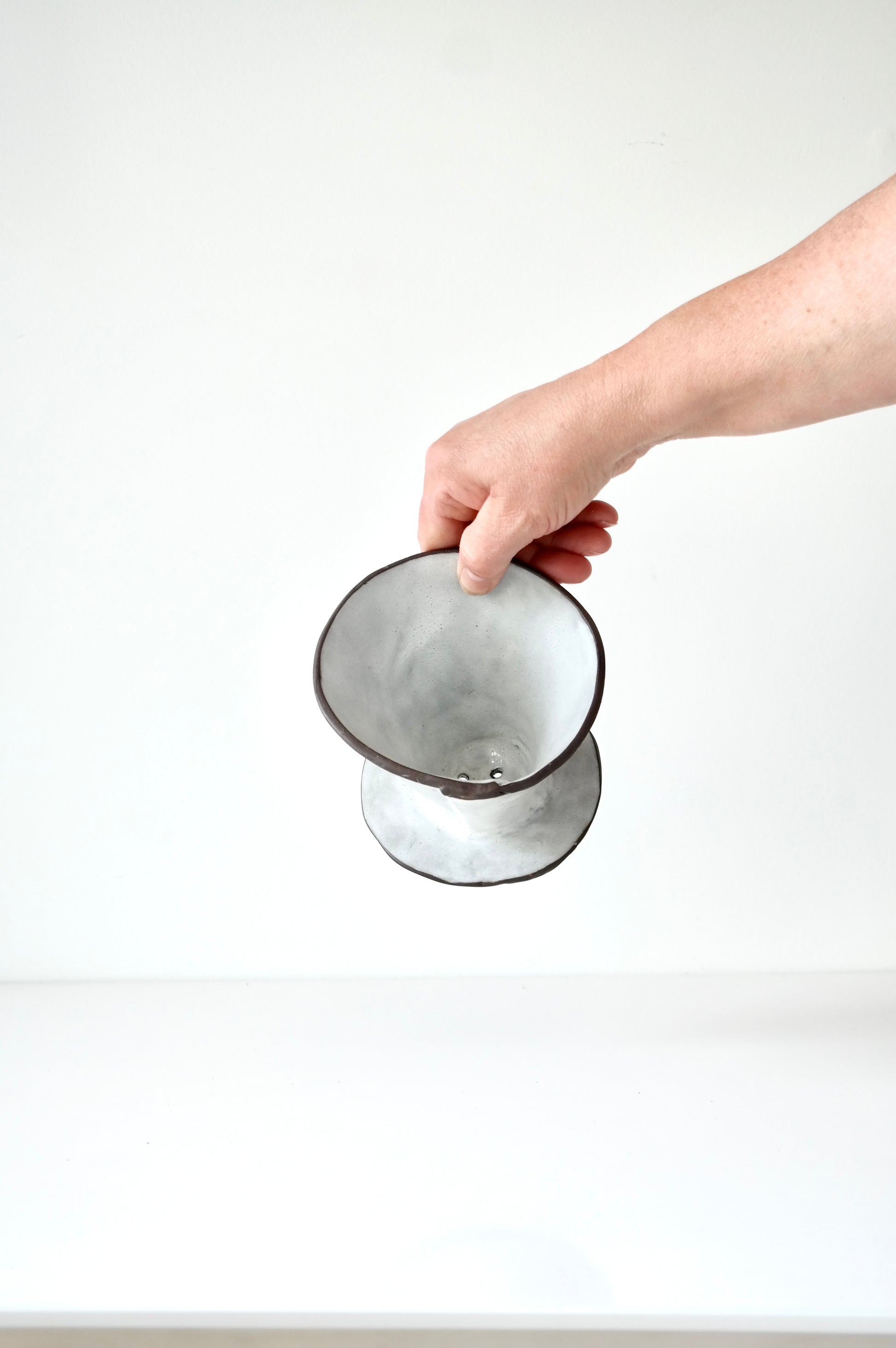 Handbuilt from black clay and finished with a soft white glaze, this pour-over brings simple beauty to your morning ritual. Its sculpted shape and organic rim add a quiet charm to the countertop, while still brewing a clean, flavourful cup.