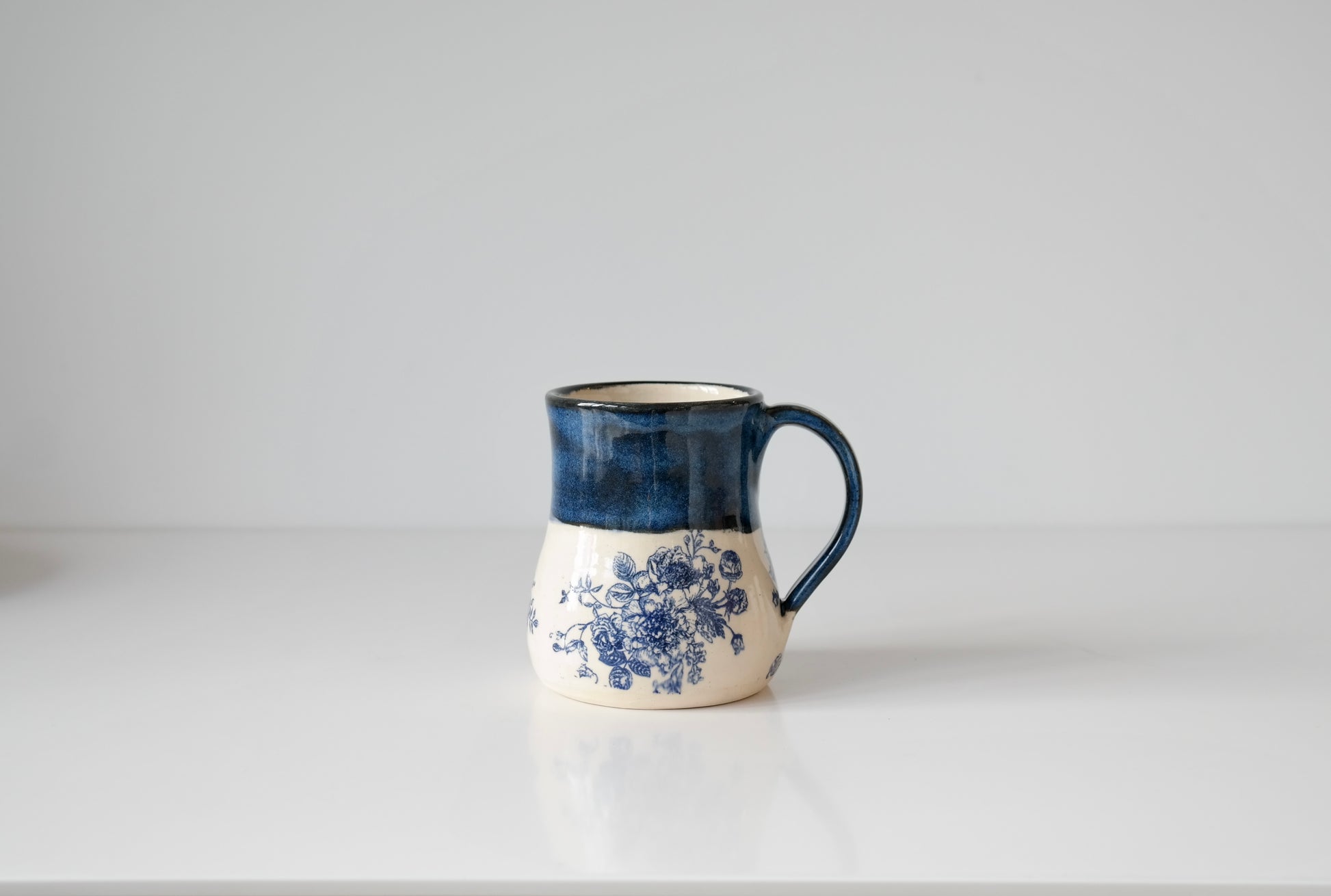 This handcrafted ceramic mug is decorated with intricate blue floral designs on a creamy white base, topped with a soft, flowing blue glaze around the rim and handle. Its generous shape and comfortable grip make it perfect for enjoying a cozy cup of coffee, tea, or hot chocolate. A timeless piece that blends function with beauty, bringing a touch of elegance to everyday sipping.