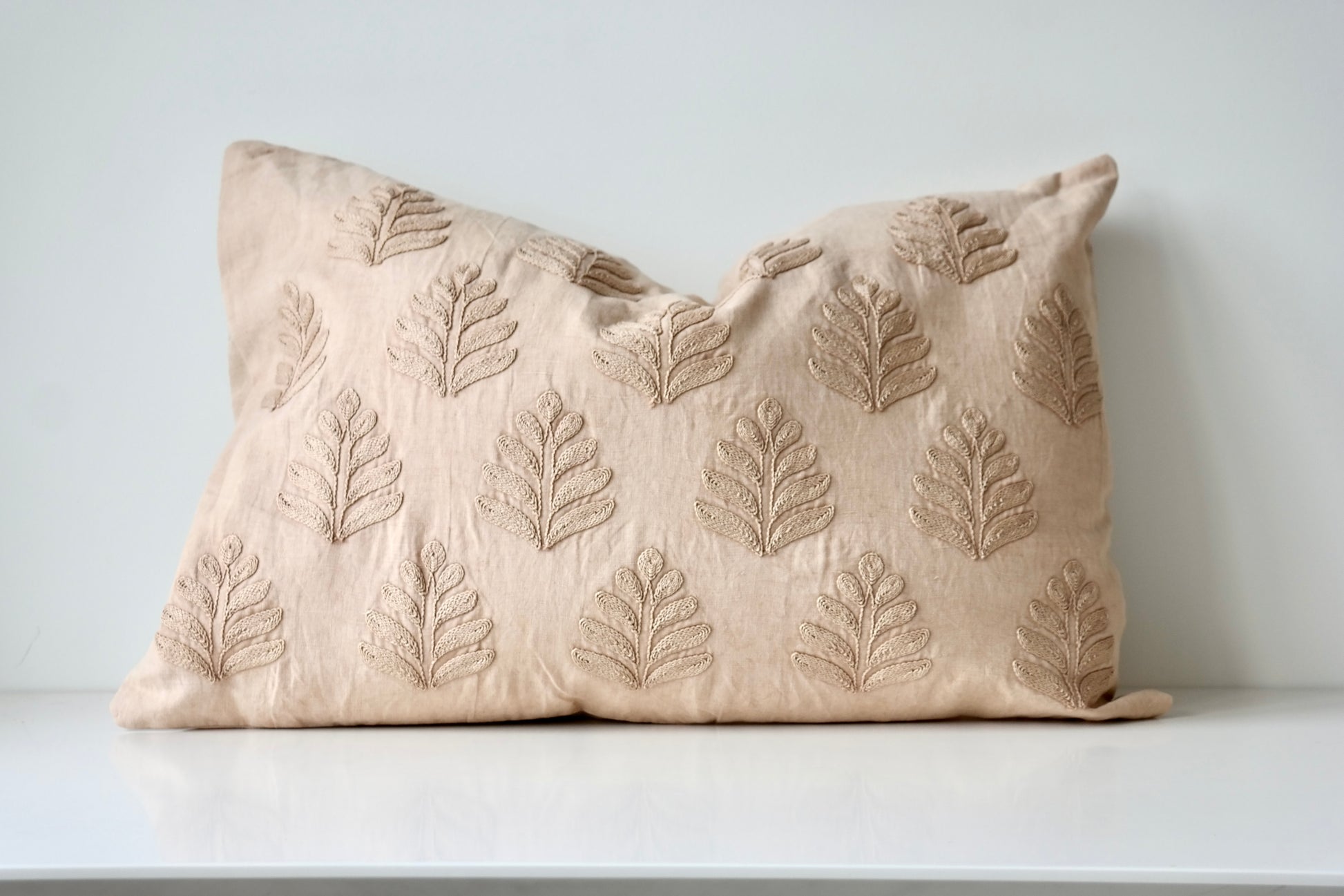 A timeless accent for any room, this pillow features a hand-embroidered leaf motif on a natural Sand coloured cotton base. The tone-on-tone stitching adds beautiful texture while keeping the look subtle and organic. Style it on a sofa, chair, or bed for an effortlessly layered and inviting feel.