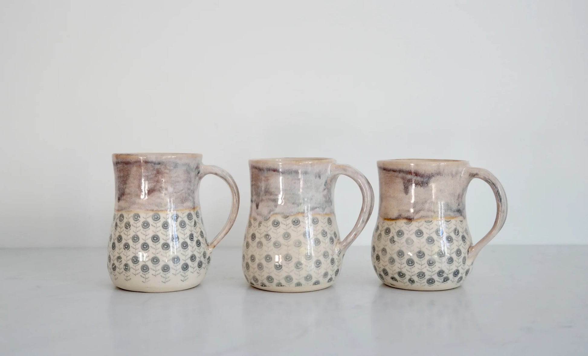 Crafted on the wheel from white stoneware clay, this mug features a vintage-inspired underglaze transfer pattern along its lower portion. The top is layered with soft purple glazes that gently reveal whispers of warm browns beneath, creating a subtle, timeless depth.