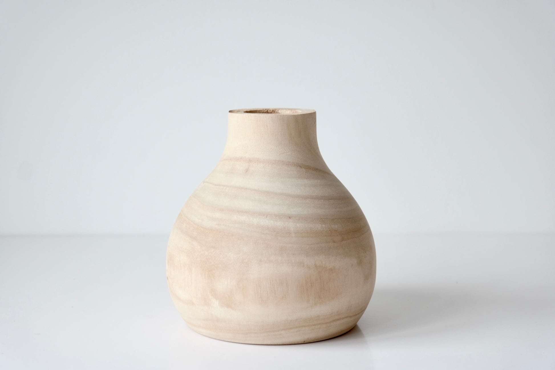 Elegant and minimal, this hand-carved wooden vase celebrates the beauty of natural grain and form. Its soft curves and matte finish make it an ideal statement piece on a console, dining table, or shelf. Style it with dried stems or let it stand alone as a simple sculptural accent.