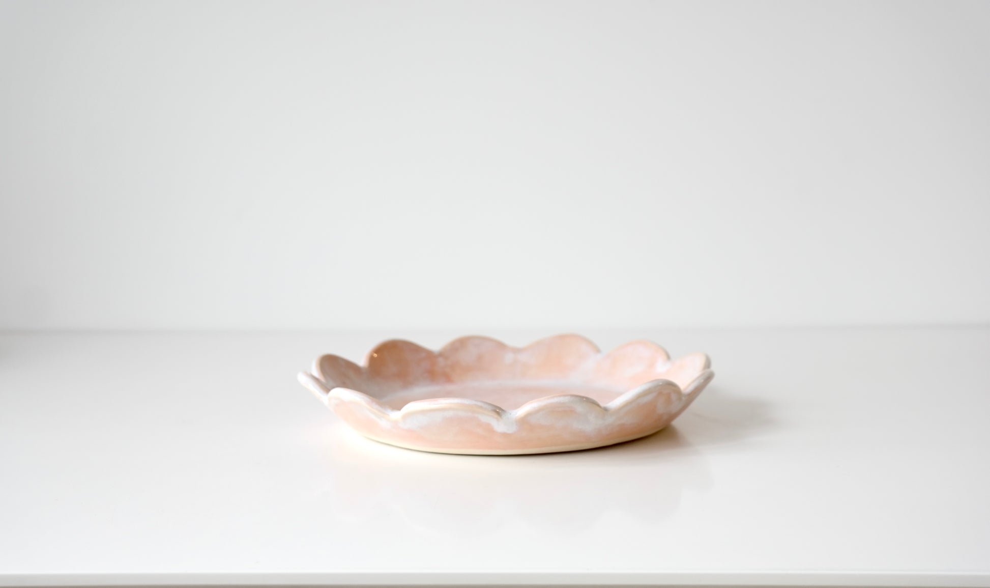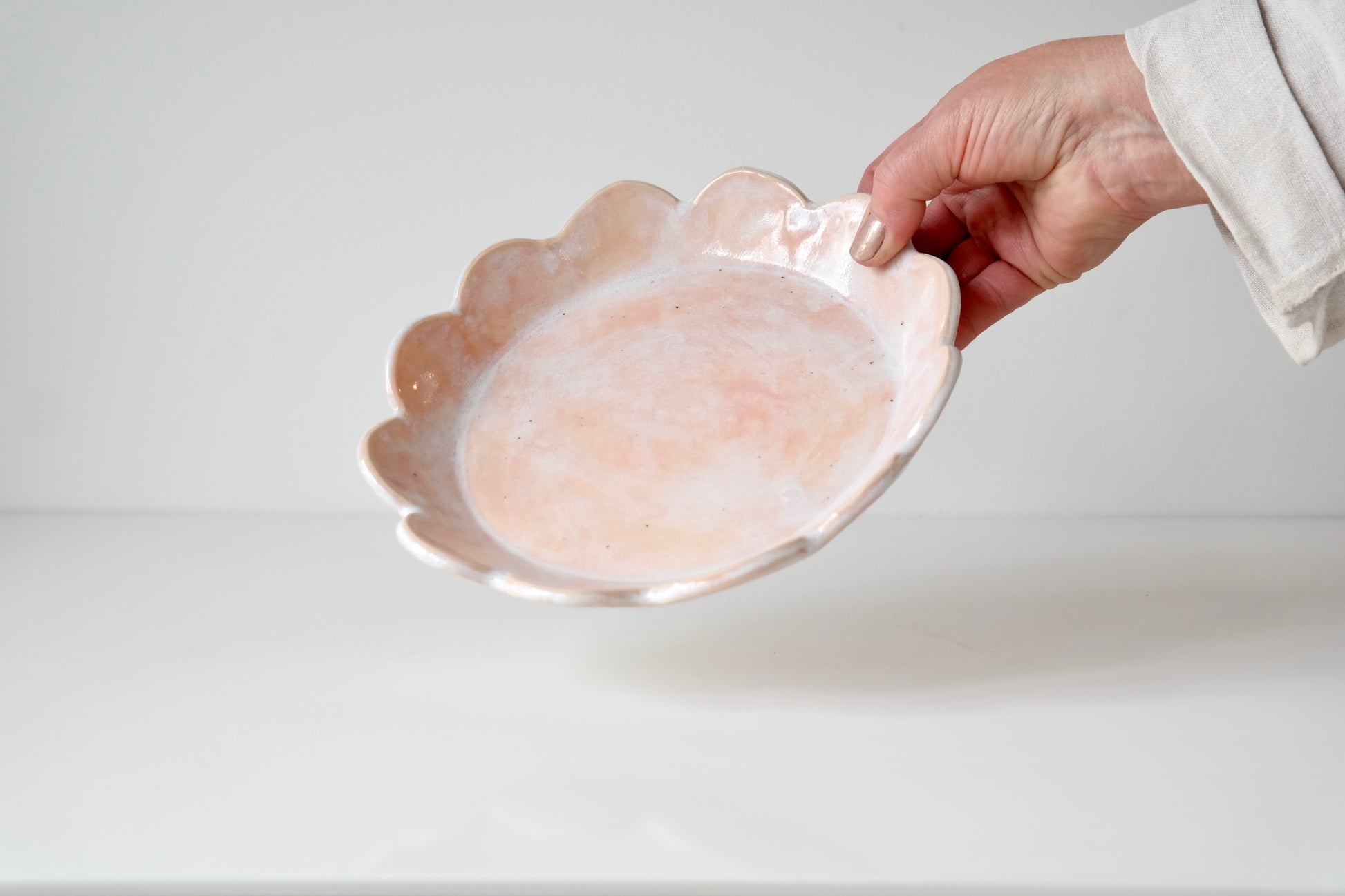 Hand-formed with a softly scalloped rim and finished in a delicate blush glaze, this dish brings a touch of warmth and charm to any space. Use it to serve small treats, display jewelry, or simply enjoy as a decorative accent. Each piece is one of a kind, showing gentle variation in tone and form.