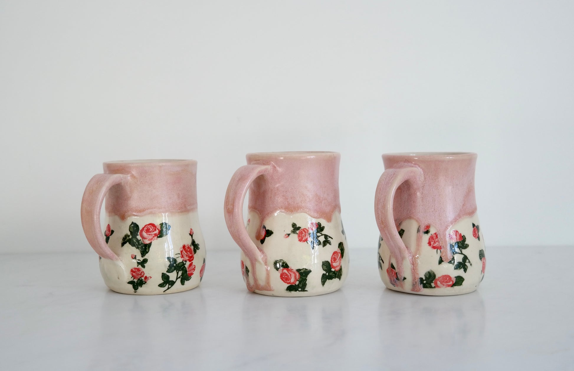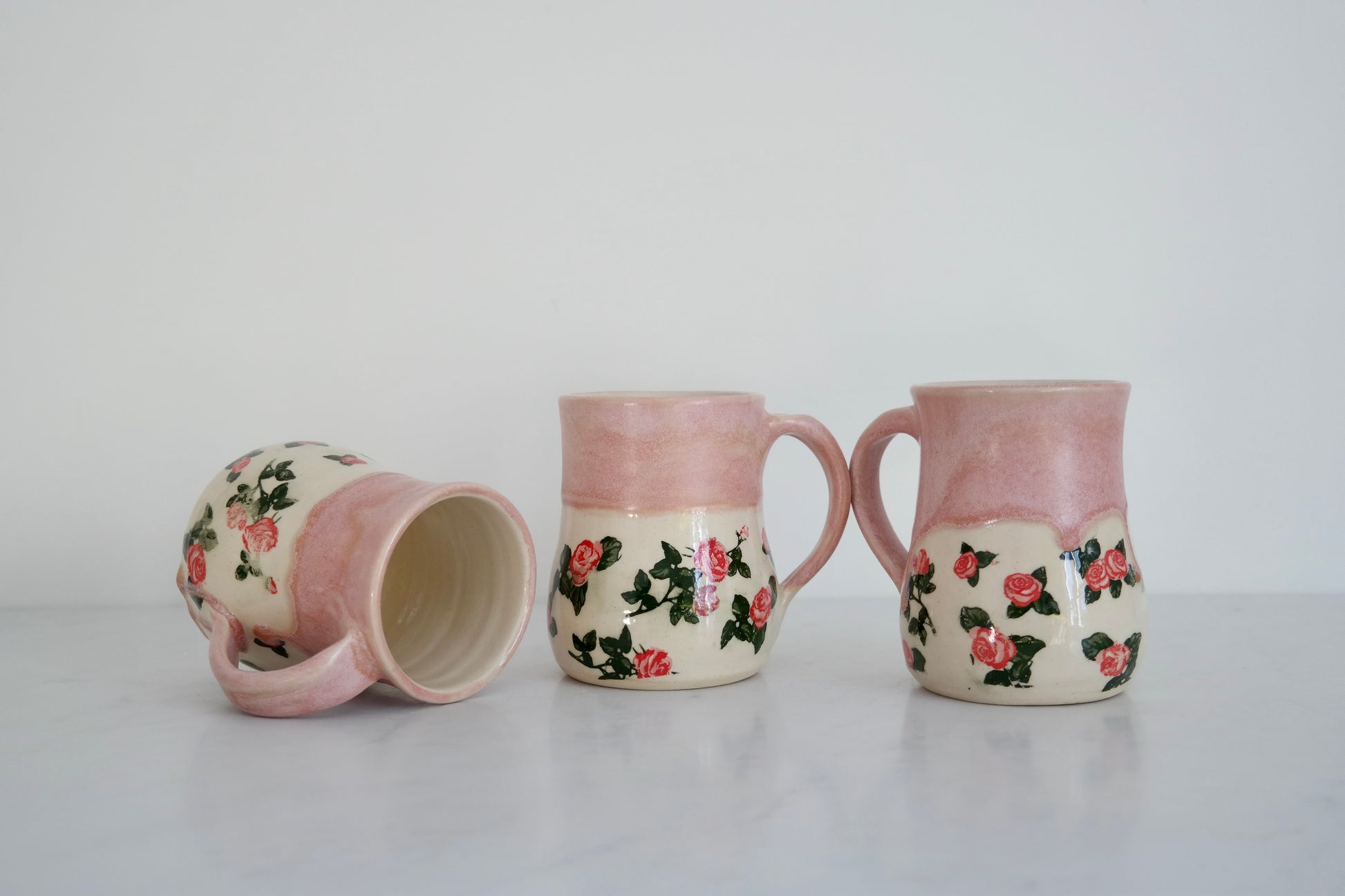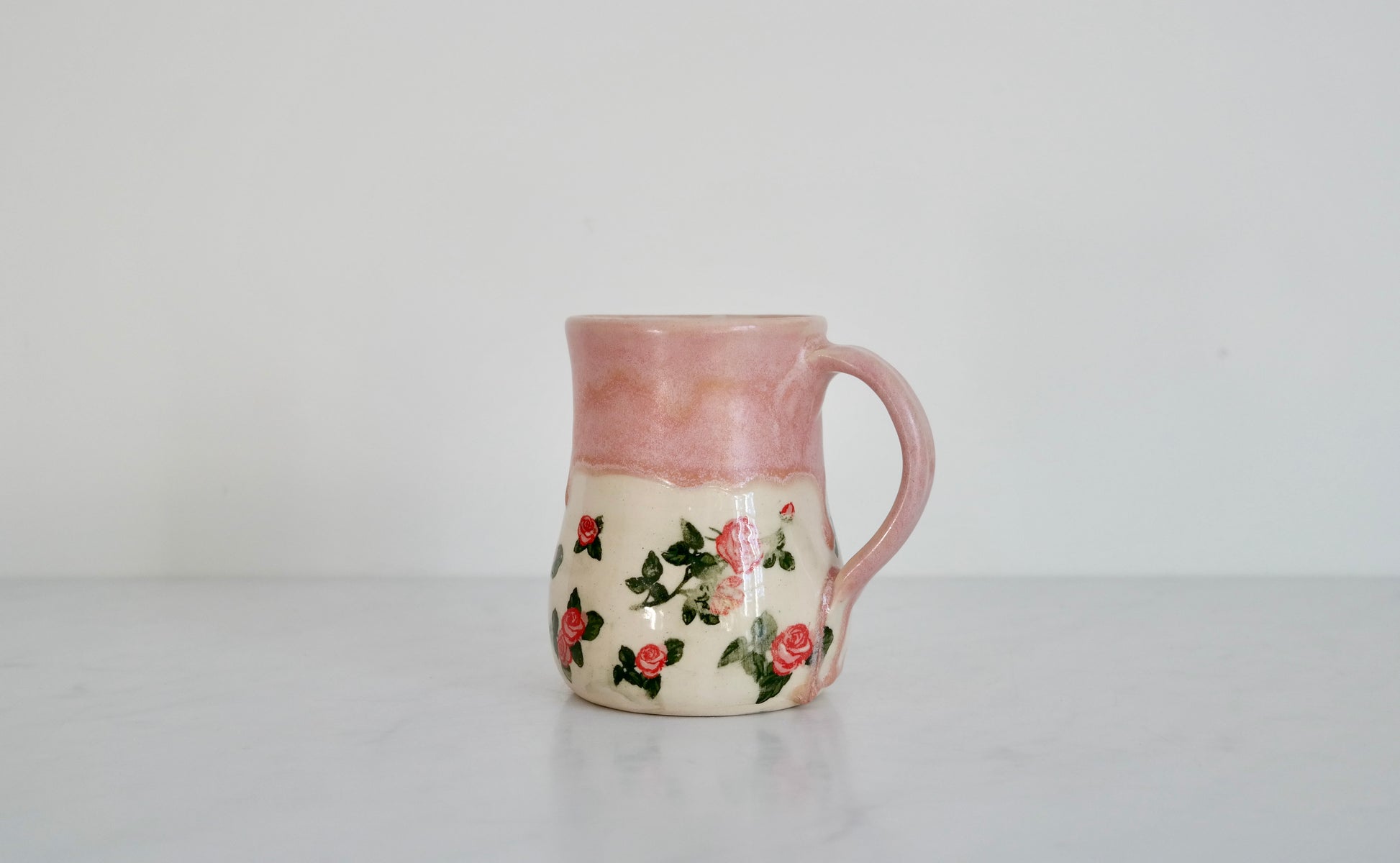 Crafted on the wheel from white stoneware, this mug is finished with a soft pink glaze crowning its top, while delicate rose decals bloom gracefully along the bottom half. A clear glaze seals the piece, adding a gentle shine and protecting its handcrafted charm.